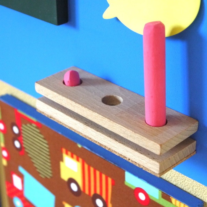 チョークにぴったりの穴があれば、片づけやすいですし、3本と決まっているので、つかわないような短いチョークがたくさんおきっぱなしということもなくなりそうです。木の板ではなく、発泡スチロールの板を使って軽くしたので、壁に貼るときは両面テープで大丈夫です。同じく、ファブリックボードの木も軽い素材のものにしました。