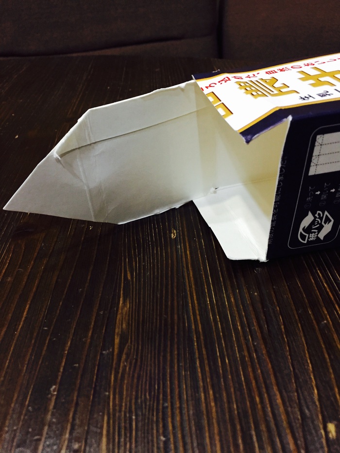 始めに切り取った牛乳パックの残りの糊付けされた部分を切り取り、大きな扇子折りにし、ケースの底にボンドで固定します。これをすると、ティッシュが少なくなっても押し上げてくれるので取りやすくなります。