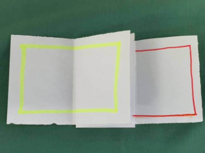 そして、重なってない方(赤)を中央に合わせて折ります。この繰り返しで重ねていきます。そうすれば、ティッシュのように連なって出てくるのでとっても使い勝手がよくなります。