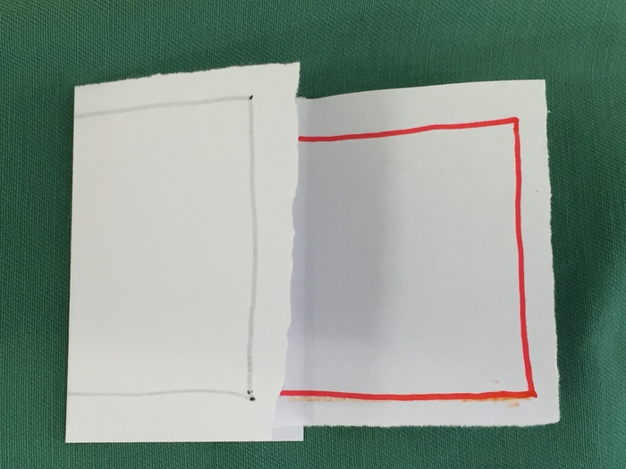 まず、1枚をペラっと開き(黒)もう1枚を先に開けたティッシュの中央に合わせて重ねます(赤)。