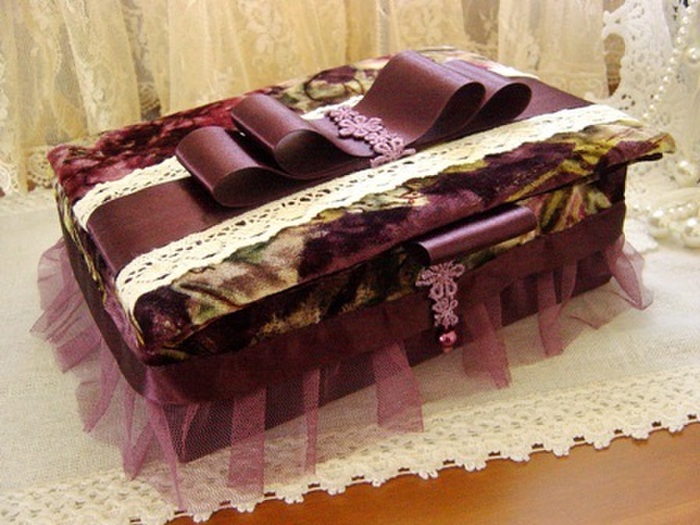 生地はもちろん、腰のリボン、肩紐、裾のレースなども使って、ドレスのような可愛いボックスに仕上げました。