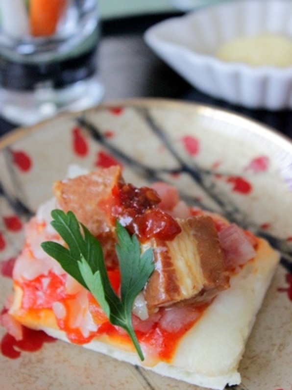 冷凍ピザですが、豚の角煮のマスタード和えや、コチュジャンをのせたりして、大人風にアレンジ★