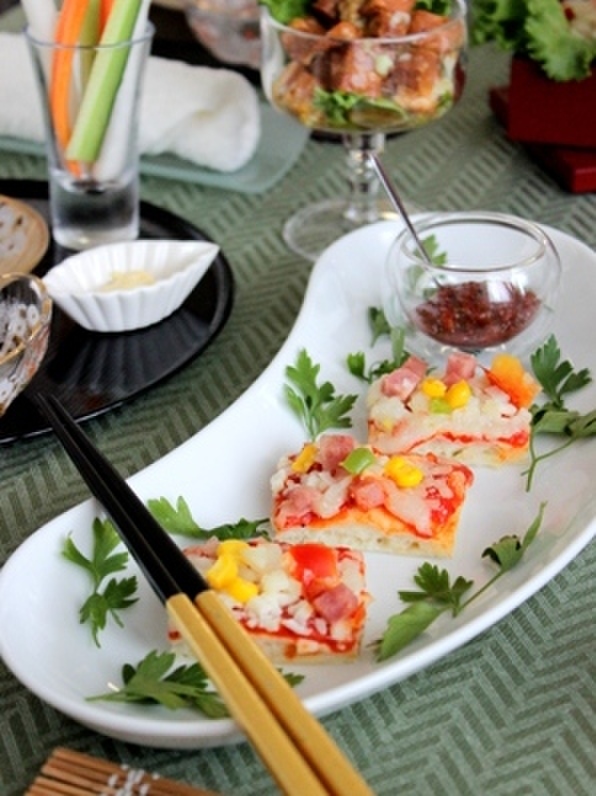 メインはピザなのですが、お箸で食べられるように、一口大にカットしています。