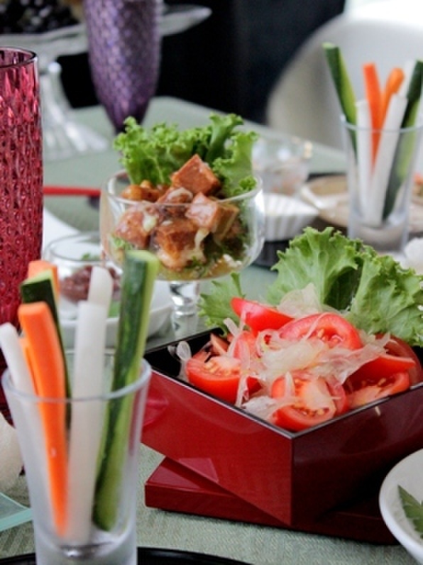 テーブルが狭いので、生野菜はスティックにして、100均のミニグラスに立てています。