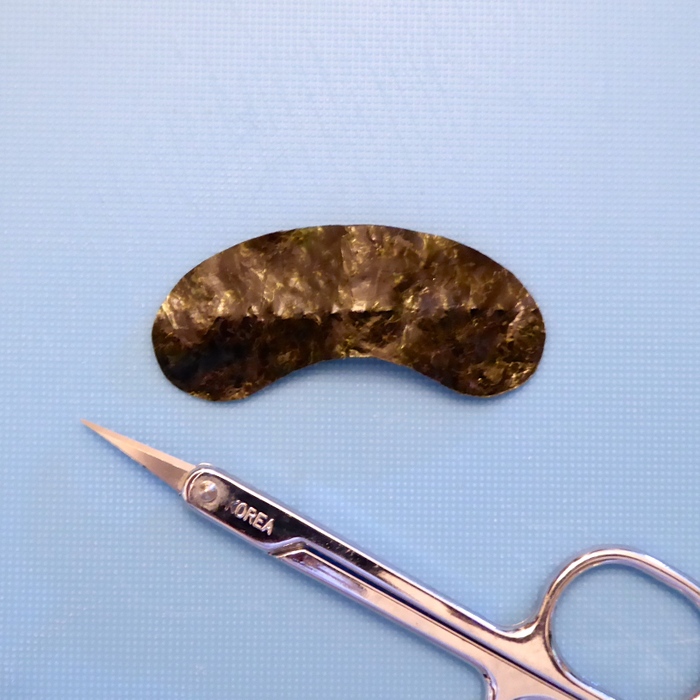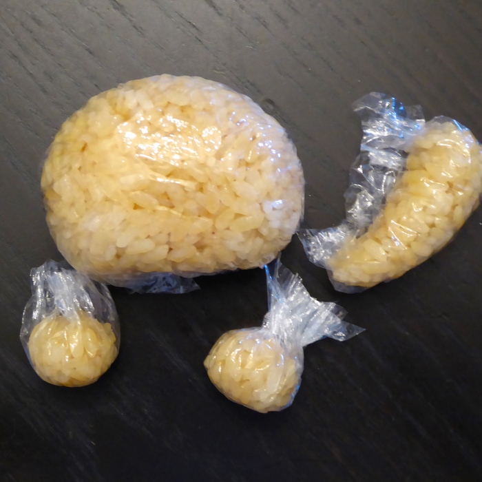 目の部分はビーンズ型に海苔を切ってご飯に貼り付けます。