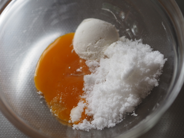 耐熱容器に卵黄と砂糖と小麦粉を入れて泡立て器で混ぜます。
