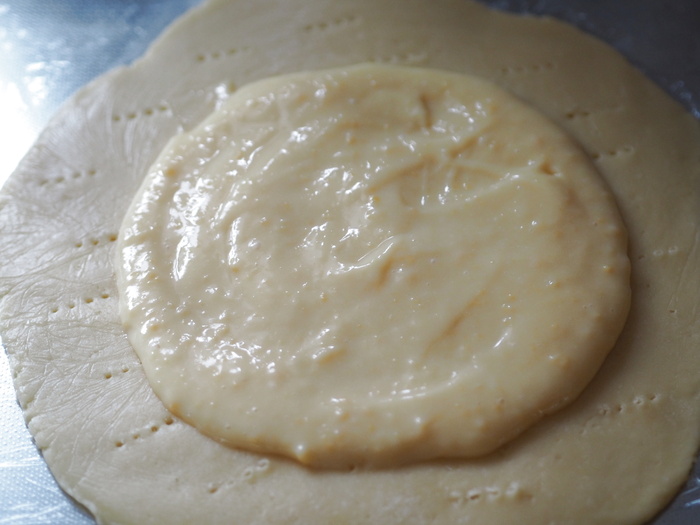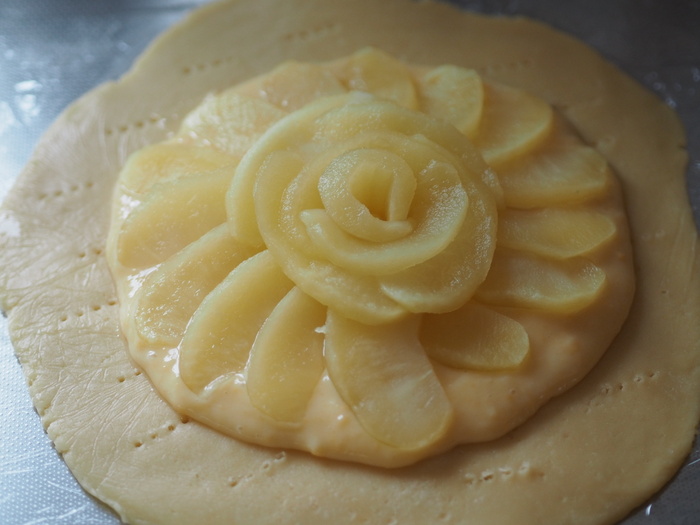 では早速作ってみましょう。今回はタルト生地の中に、レモン味のカスタードクリームを敷き、その上にりんごのコンポートをのせたタルトに挑戦します。