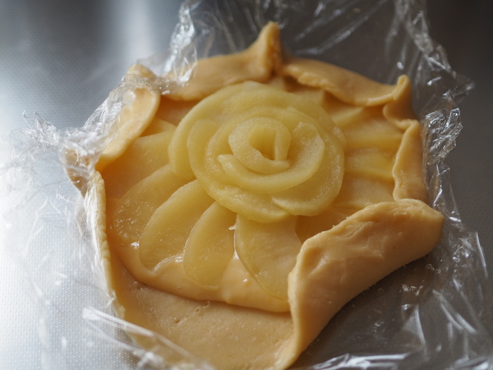 以前型を使ってタルトを焼いたことがあるんですが、確かに見栄えは良いのですが、一つひとつのひだの部分に生地を入れ込んだり、型から溢れ出した部分は切り取ったり、そして焼き上がった後はまたひだの部分までキレイに洗わないといけない・・・など面倒なことが多かったのですが、今回の型なしタルトはそんな面倒な部分は一切なし!しかも自分の好きな形のタルトに出来るし、ちょっと工作感覚で楽しかったです。ちょっといびつな形になってもそれはそれでまたラフな感じでOK♪