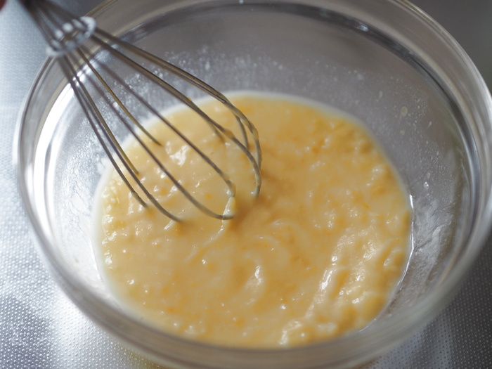 2.1に溶いた卵を分離しないように数回に分け入れて、その都度よく混ぜます。