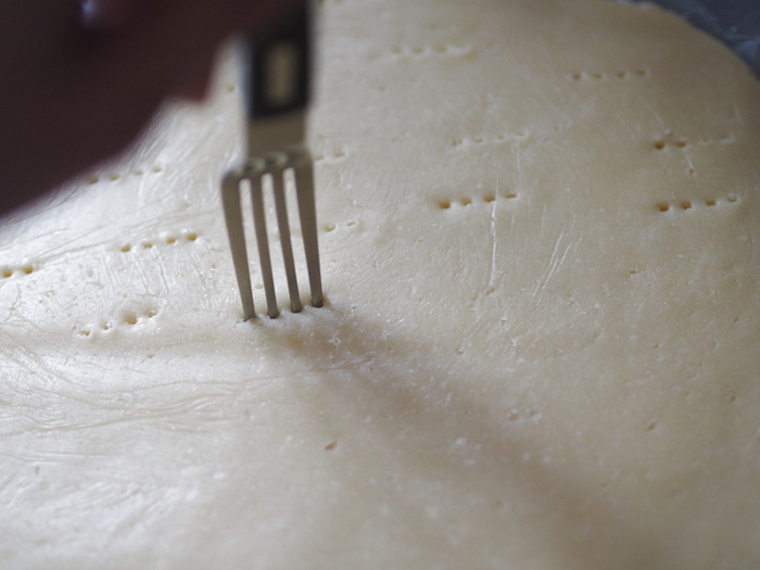 8.休ませていた3の生地をラップではさんで直径20cmぐらいに伸ばし、フォークで穴を開けます。