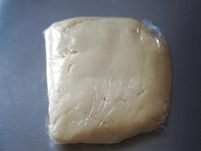 3.ふるっておいた小麦粉を2に入れてゴムベラで更に混ぜ、ひとまとめにし、まとまったら冷蔵庫で休ませます。