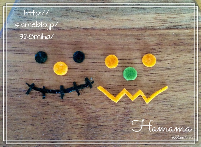 おにぎりにそれぞれのパーツを付けて、頭ににんじんときゅうりのへたを付けたら出来上がりです♡