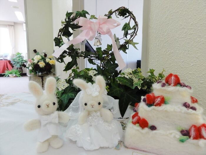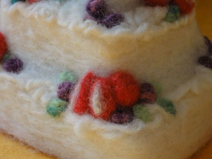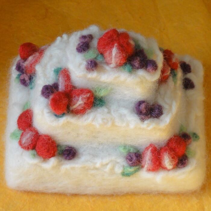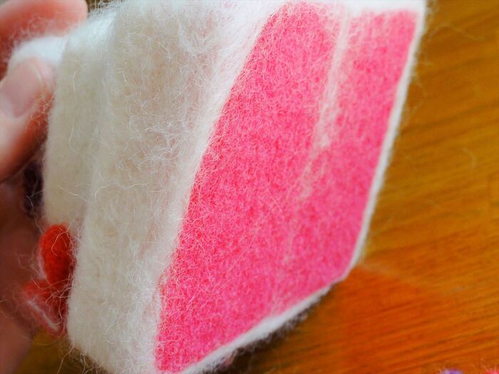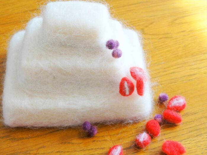 スポンジをカットして3段のケーキにして周りを白い羊毛フェルトで覆ってチクチク刺しました。