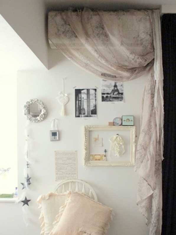 エアコンの上の部分、天井の出っ張りとカーテンレールを囲っているボックスのような物の間につっぱり棒を渡し、フレンチリネンのカーテンを使って、生活感が出るエアコンを隠しているんです。(我が家は真夏の数日間しかエアコンを使わないので、これでOK。ほこりよけにもなってます。)