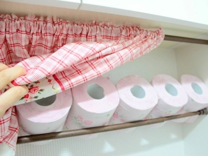 そこで、その棚の下につっぱり棒を渡し、トイレットペーパーを置いてみました。壁を利用して斜めに置けば、細い突っ張り棒1本で支えられ、しかも取り出しやすい!