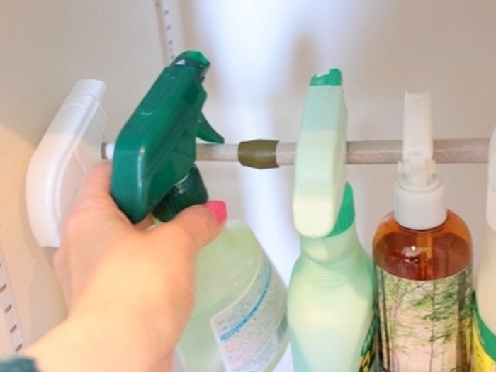 キッチンの隅に小さな収納庫が付いていて、一番下にゴミ箱を置いています。その上の空間がぽっかり空いていてもったいなかったので、短いつっぱり棒を渡して、スプレー式の洗剤などを引っ掛けて収納しています。