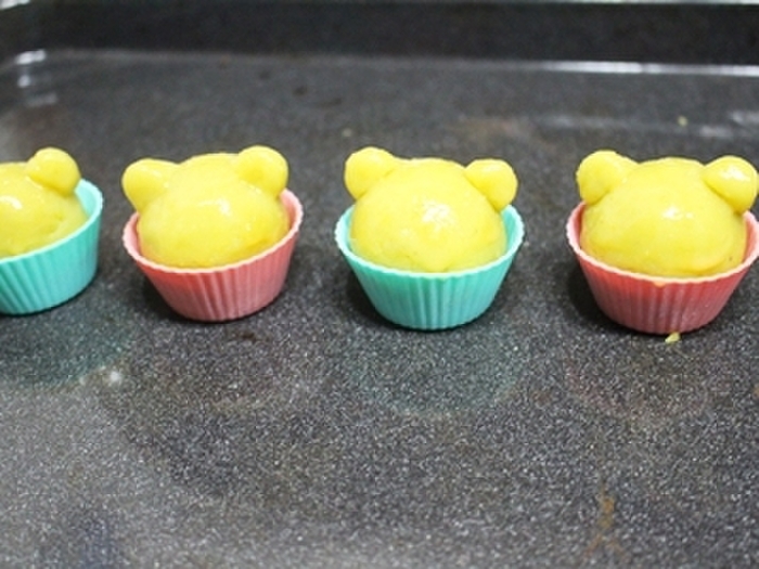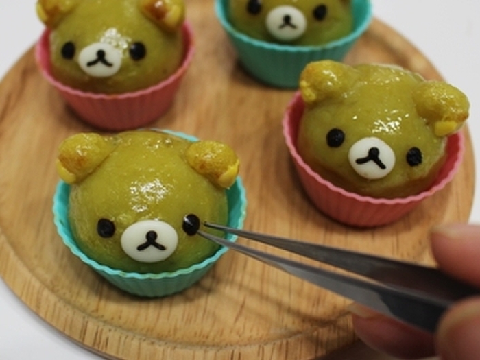 カップの大きさに合わせ、丸またはドーム状にする。耳は小さな丸を作り押し付け後ろ部分を馴染ませリラックマの形に整える。