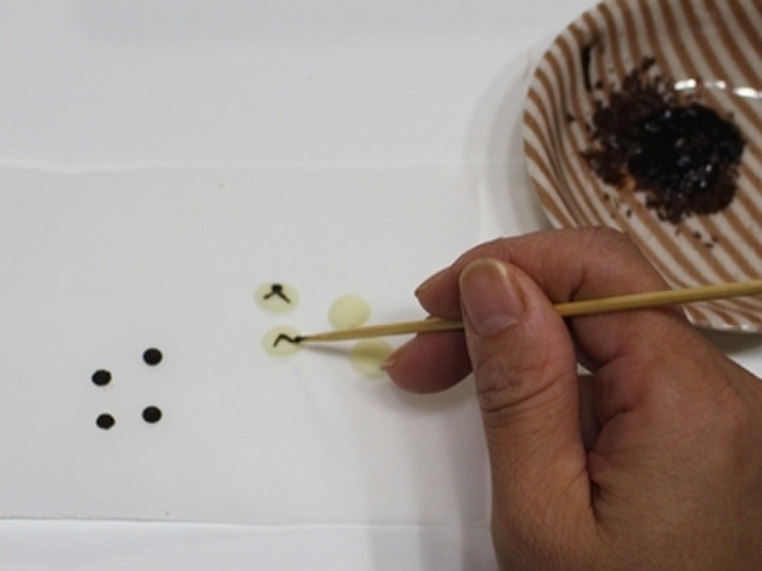 チョコペンを60度の湯煎で溶かし、クッキングシートの上に顔のパーツを描く。