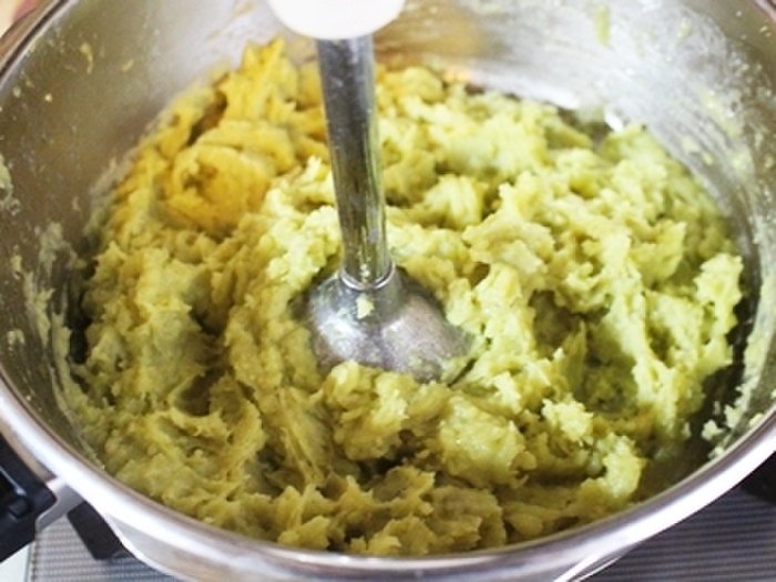 鍋にさつまいもとバター、砂糖、生クリームを入れマッシャーやハンドミキサーで潰し混ぜ、弱火で水分を飛ばす。
