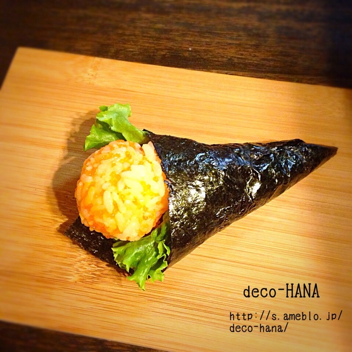 丸いおにぎりを作り、手巻き寿司の上にのせる。