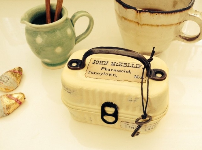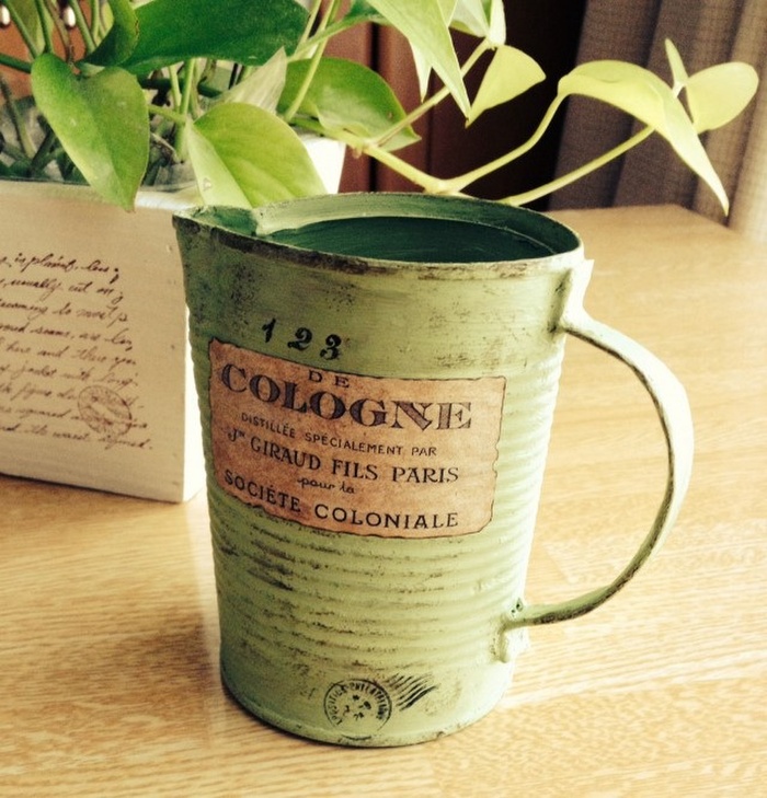 こちらはトマト缶で作ったピッチャーです。アクリル絵の具が乾いた後に、スポンジを使って水性ニスをポンポンと所々に付けてアンティーク風にしてみました。角部分を重点的に汚しています。汚しすぎには注意です。