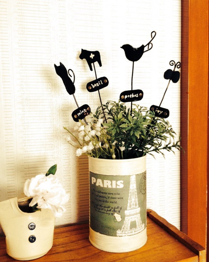 キッチンばさみで形を切り抜き100均ワイヤーを付ければ、こんなガーデンピックも簡単に作れちゃいます。ラベル部分も缶なので外でも使っています。