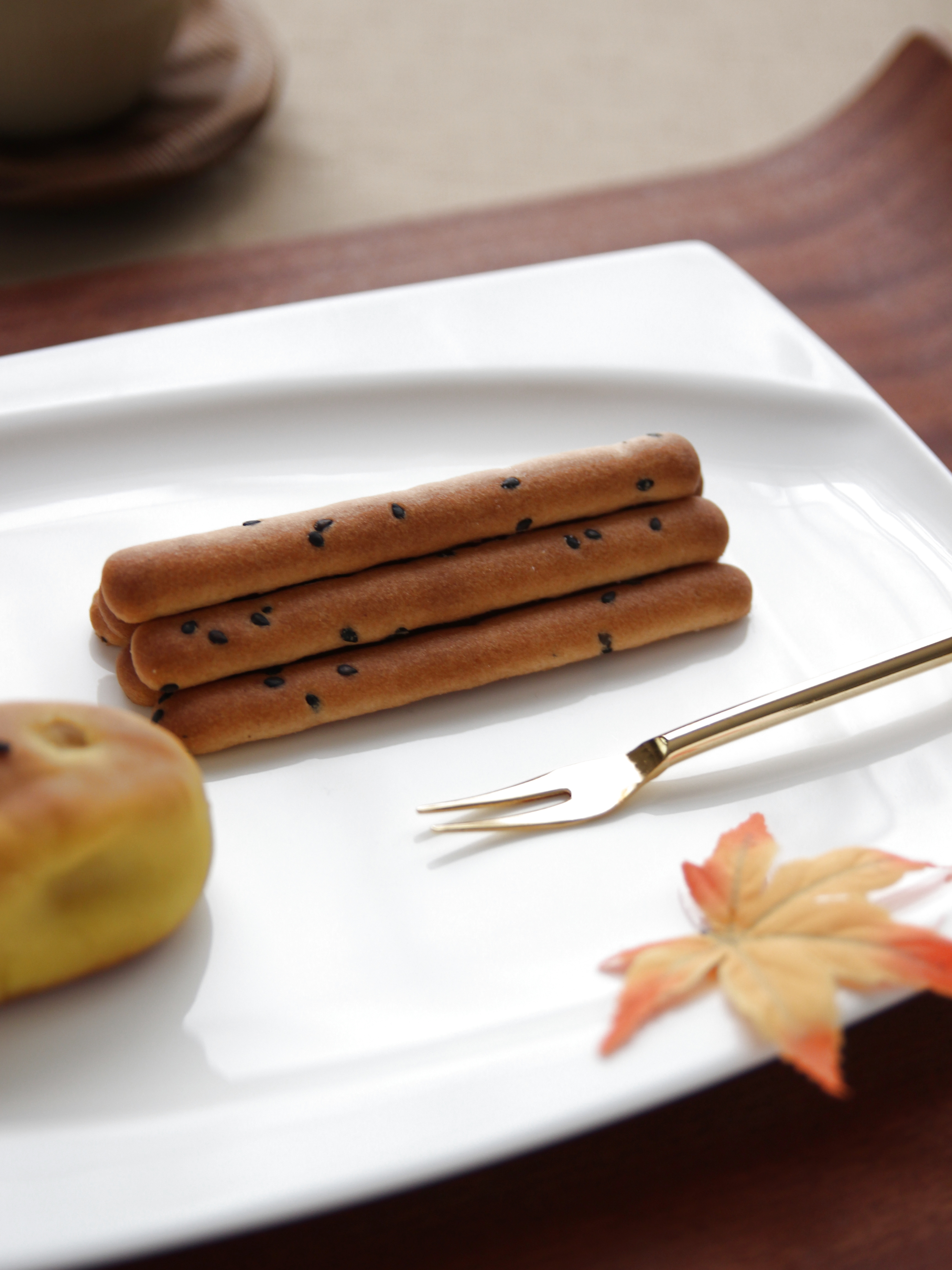 市販の黒ごまのスティッククッキーも整えて積み上げるだけで、おしゃれにみえます。
