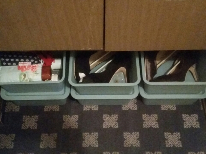 玄関には靴箱の下にスタッキングして、季節外の靴やヒールが高くて靴箱に収納出来ない靴を入れています。