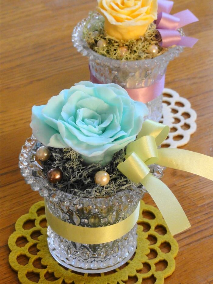 ガラスの器に給水スポンジ(ドライフラワー用があればそちらでも)がセットされてスポンジの上にモスが被せてある状態にします。