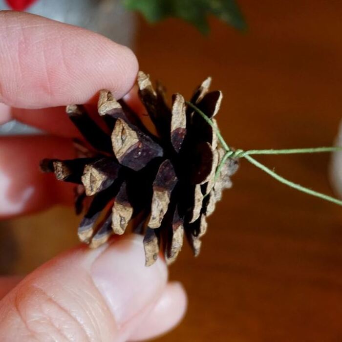 松ぼっくりはワイヤーをひっかけてねじっておきます。