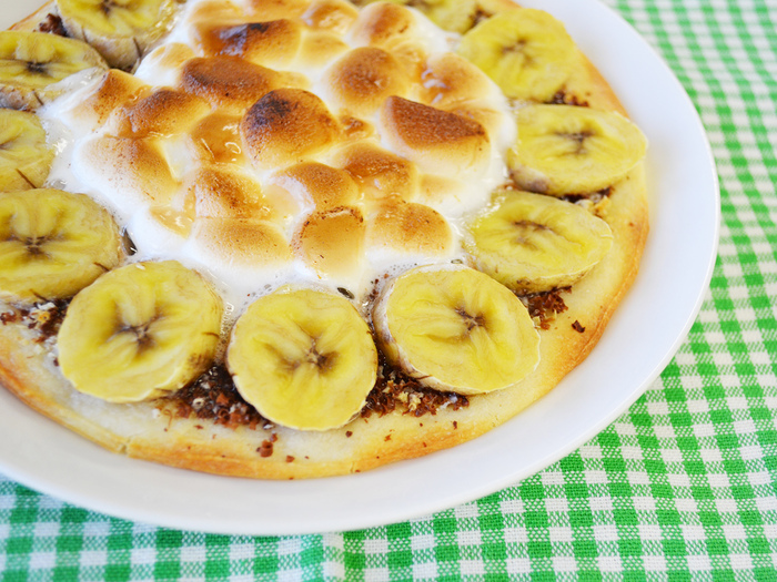 ピザ生地に、チョコ、マシュマロ、バナナをトッピングして焼けば、チョコマシュマロピザに。お洒落でおいしい!