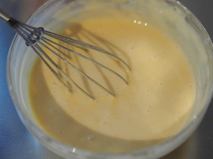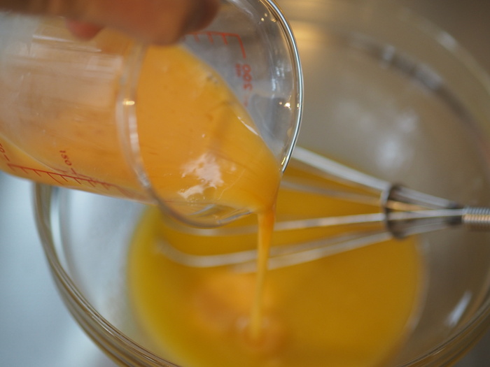 2.1に溶いた卵を少しずつ入れながら、よく混ぜます。