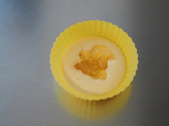5.カップの半分下ぐらいまで4の生地を入れ、お好みのジャムをのせます。その上から残りの生地を流し入れます。