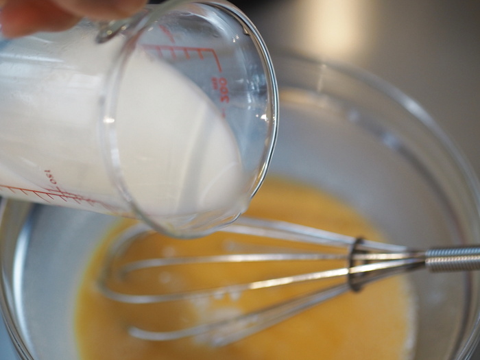 3.続いて2に牛乳を少しずつ入れながら、よく混ぜます。