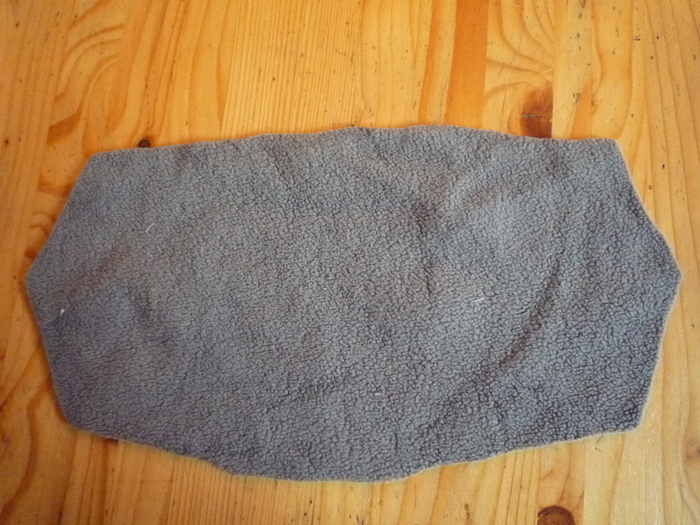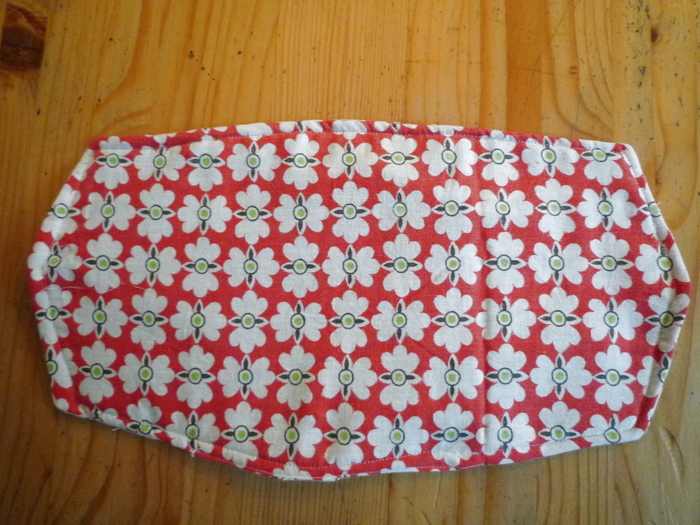 今できたものと同じ大きさにフリースを裁断し、返し口から中に入れ、形を整えます。柄布の返し口を閉じ縫いし、さらに端から7mmくらいのところを全体ぐるりと押さえ縫いします。