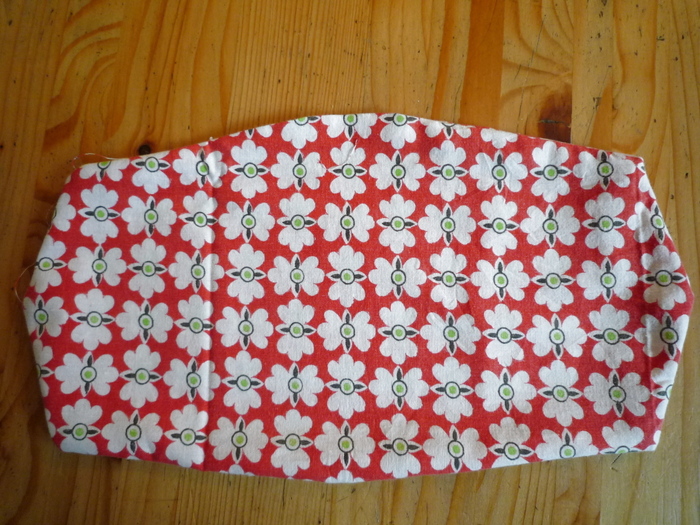 柄布を中表に二枚重ね、先ほど引いた線の通り、一部に返し口を残して、ぐるりと縫います。縫ったら縫い代を短めに切り落とし、表に返します。