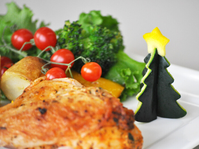 クリスマスツリー。ズッキーニの皮をかつら剥きにしてさっと湯通しして型抜きしてくださいね。★はチーズで。