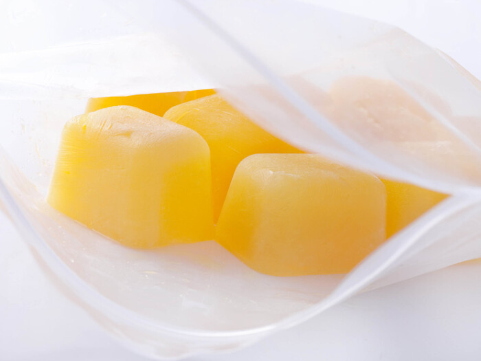 小分けに凍らせた後は袋に入れて保存する、使うときに必要な分だけ取り出せるから便利です。