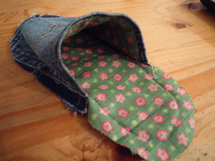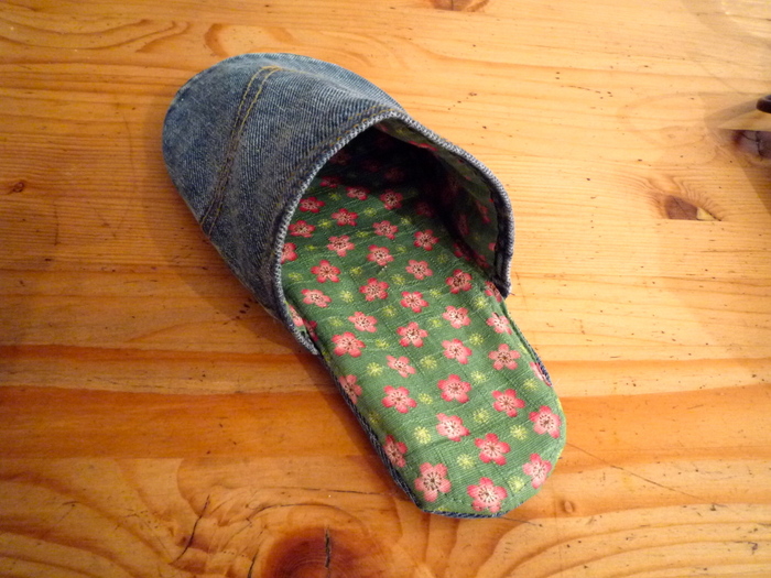 ジーンズの後ろポケット一枚、甲の裏布一枚(写真では緑の花柄)、底部分の下側用一枚(ジーンズ生地)、底部分の上側用一枚(緑の花柄)、底部分の中に入れるフリース二枚(写真では一枚しかうつっていないのですが、二枚入れたほうがクッション効果および足裏あったか効果が高くなります!)