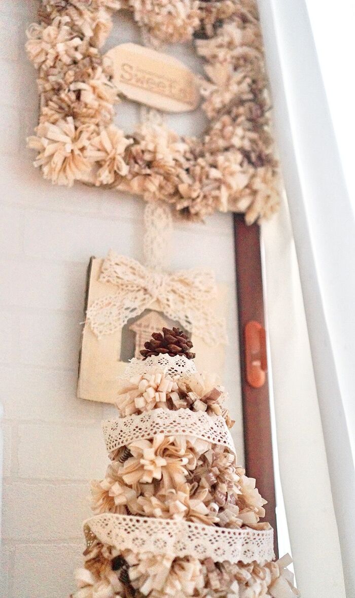 同じ時期に作ったペーパーナプキンツリーと一緒に飾ってみました。ナチュラルカラーが並んで統一感があるコーナーが廃材やお安いペーパーナプキンで出来たコーナー。来客時にちょっとした話題にもなり会話が弾む→作り方を聞かれるっという風に、日常に取り入れてもらえたのがとても嬉しかったです。