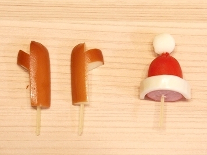 サンタ帽子は赤ウインナーに細くカットしたスライスチーズを巻き、