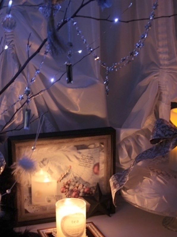 こちらは、キャンドルやキャンドル型のLEDライトもつけたバージョンです。オレンジの光にほっこり。