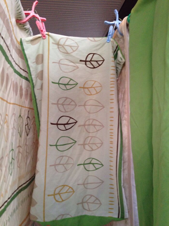 シーツを平行に二枚干すと小さな洗濯バサミがあくのでそれを使って枕カバーも干します