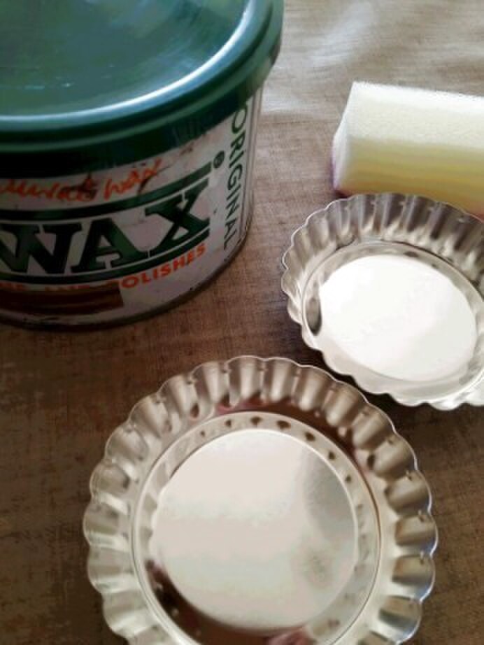 マドレーヌ型はブライワックス(ウォルナット)をスポンジでポンポンたたくように塗り、錆びた感じを出します。