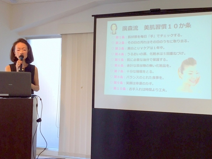 今回教えてくださったのが、ハーバー研究所の廣森知恵子さん。さすが!お肌がツルツルで、とてもキレイです。ちなみに、HABAさんの化粧品は、余計なものは一切加えないという無添加化粧品だそうです。