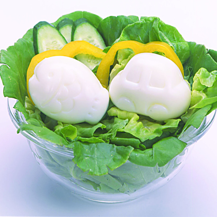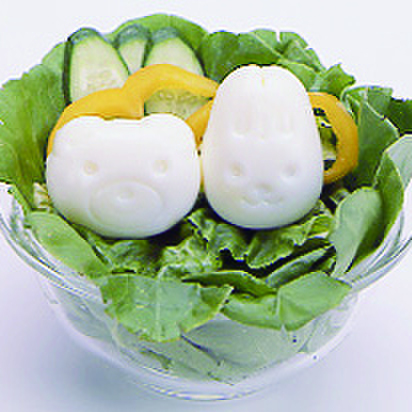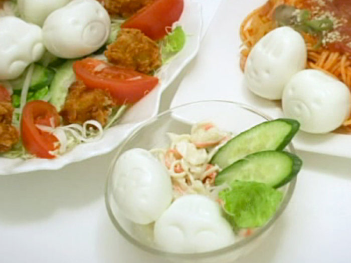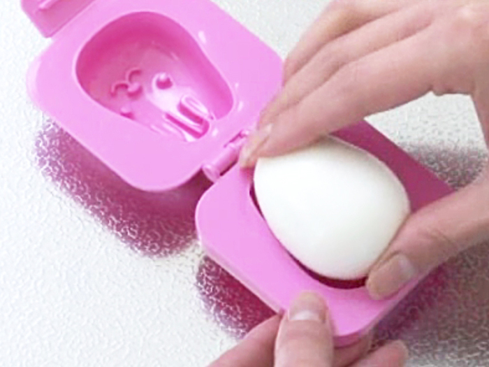 熱いうちに殻をむいて、「ゆでたまごっこ」型にはめます。