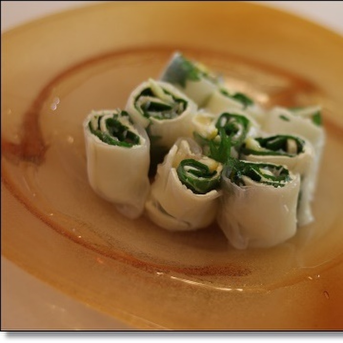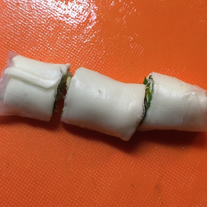 ①ライスペーパーを両面水でくぐらせ、まな板の上に置きます。その上に、チーズ、大葉、レモンの輪切りをのせて、くるくると巻いていきます。※レモンは塩でこすり洗いしてなるべく薄くスライスしてください。薄く切るのがポイントです。