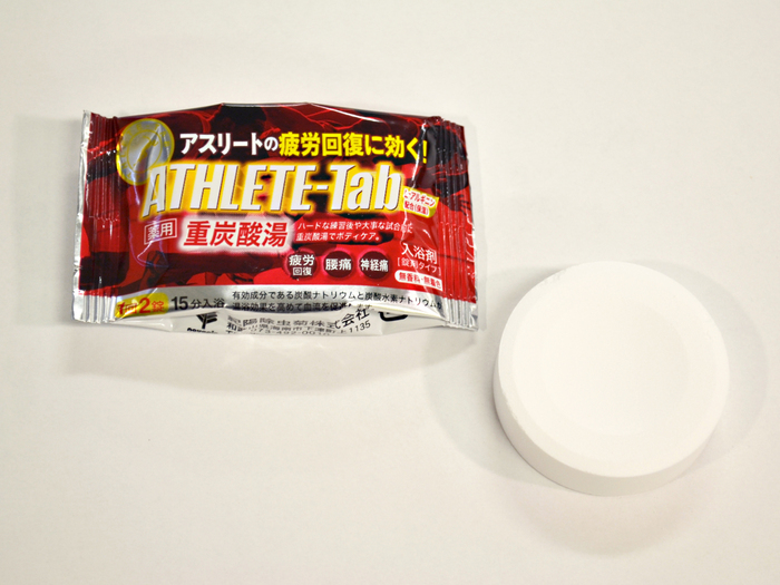 白いタブレット状の入浴剤です。ハードな試合やトレーニングで鍛えたカラダを重炭酸湯でケア。炭酸水素Naにより発生する重炭酸イオンが温浴効果を高め、体の芯まで温めることで血行を促進。疲労を緩和します。