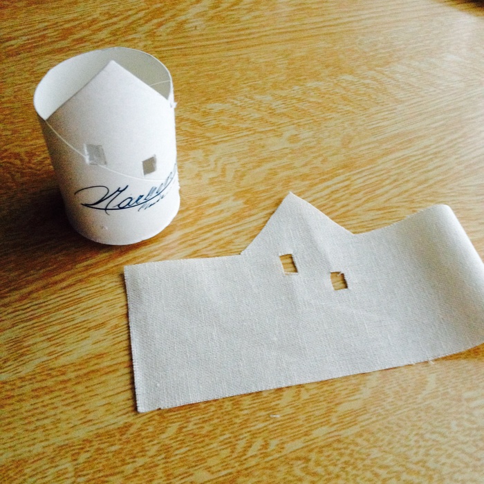 ライトを付けると浮き出るように、トイレットペーパーの芯にセリアの転写シールをしてから布を貼ってみました。