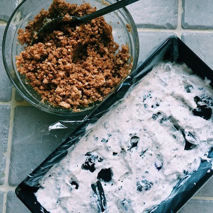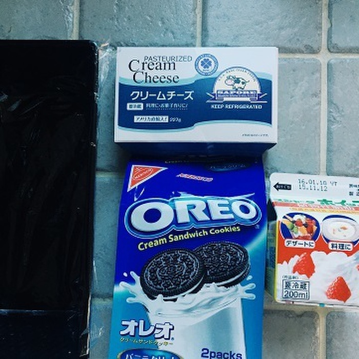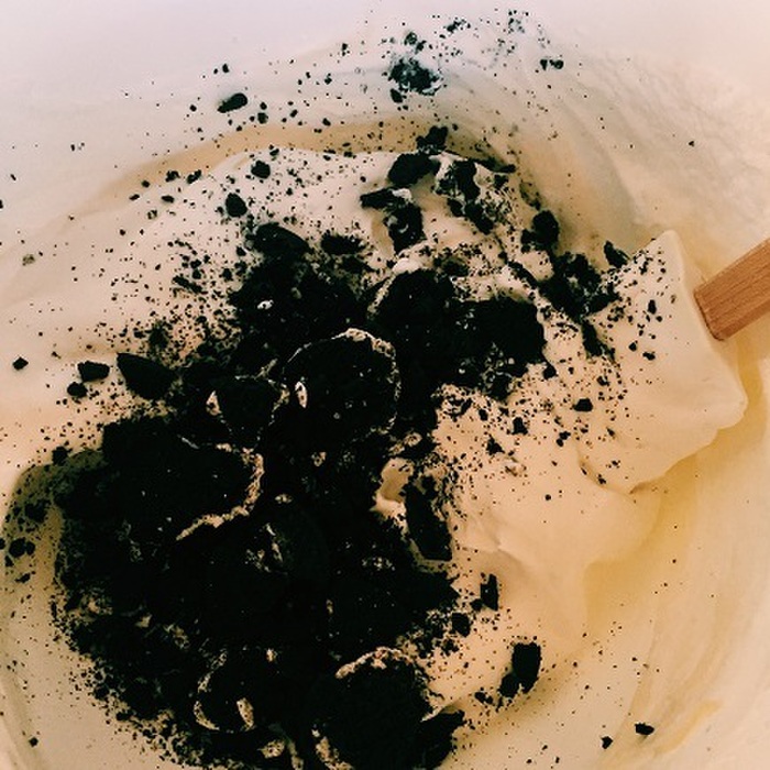 クリームチーズたちと生クリームを合わせ、荒く砕いたオレオと練乳、色のアクセントに冷凍ラズベリーを合わせて混ぜます。